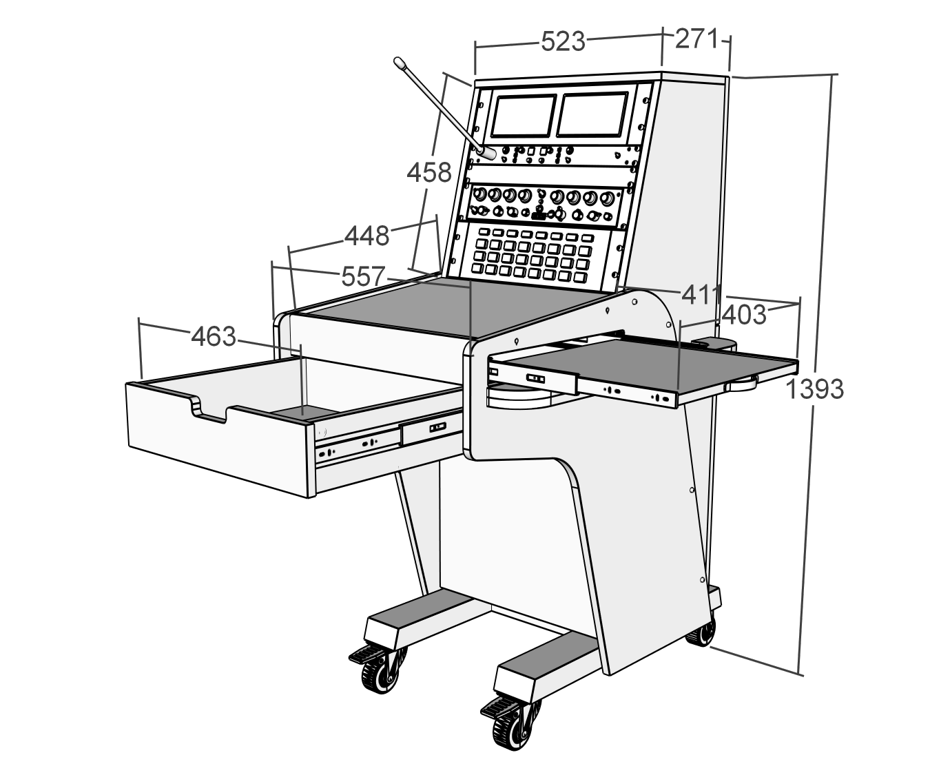 SMC 3A houses 10 rack units above the worktop and the worktop is large enough for A3 size running sheets. You'll find a large drawer under the worktop and a single door cabinet in the lower body which can house another 10 rack units of 19" equipment if required.