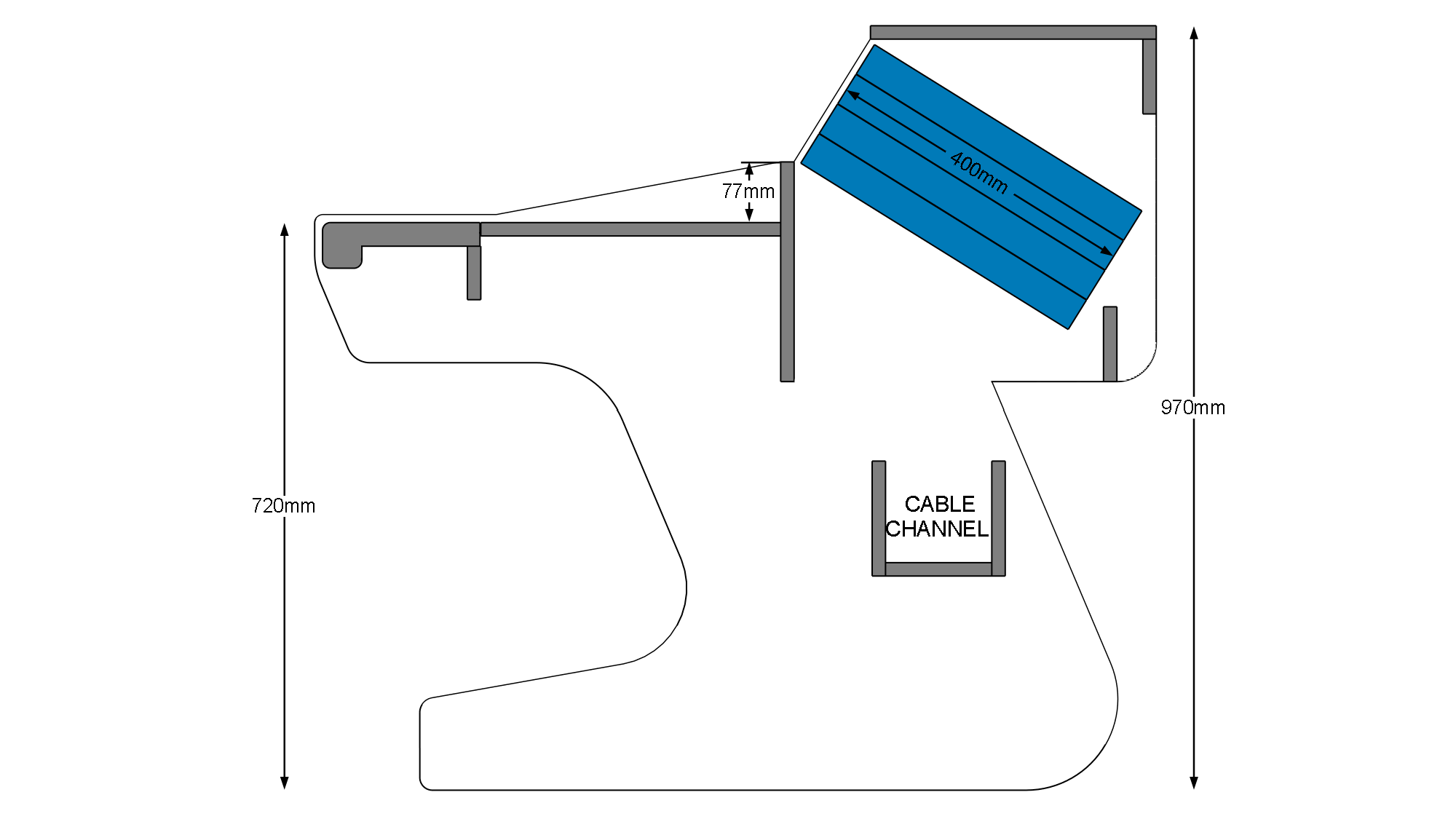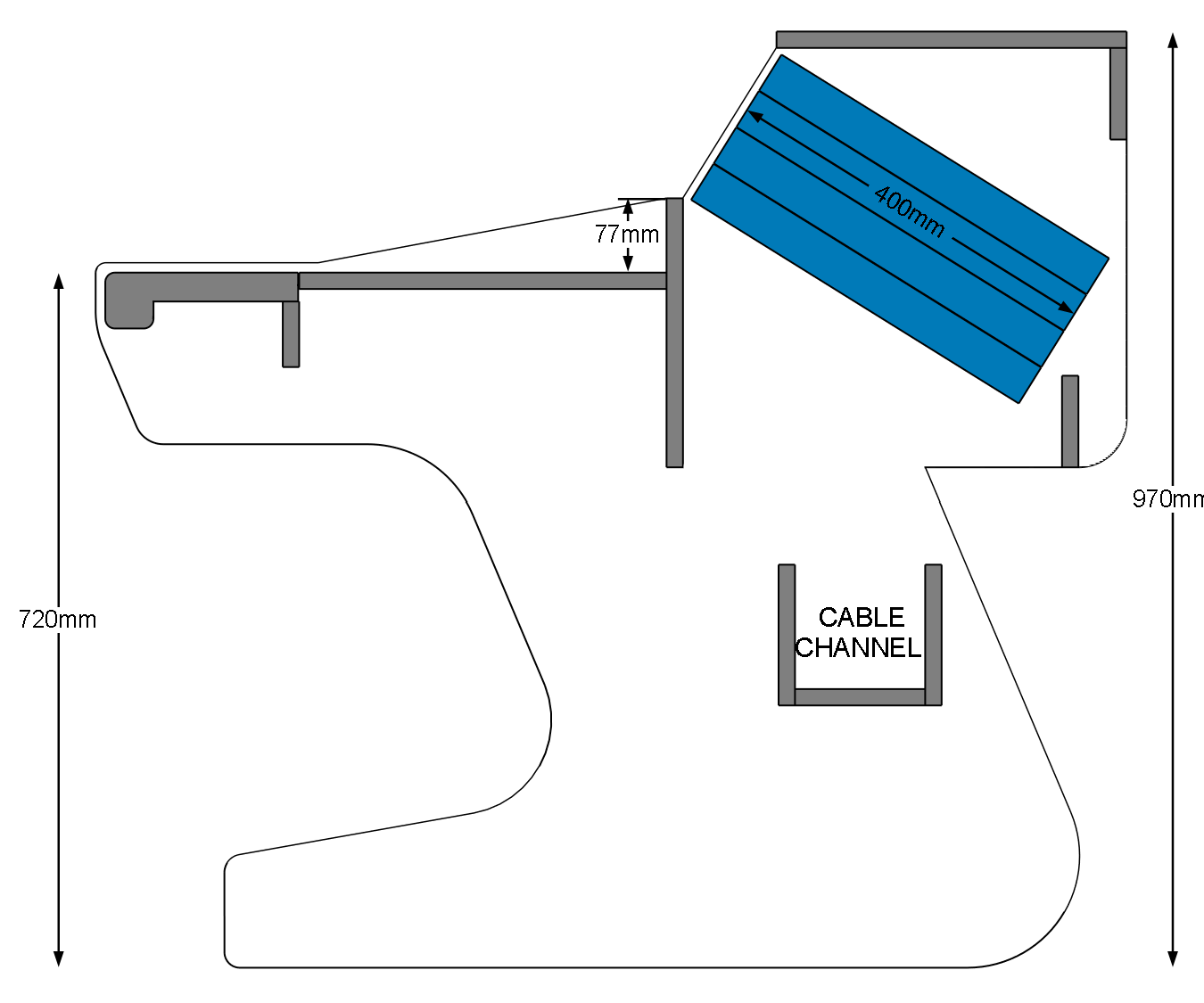 - 4 rack bays of 4RU, set 77mm above the desktop (32 degrees from vertical).
