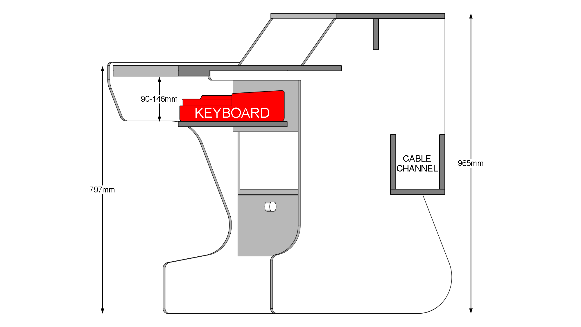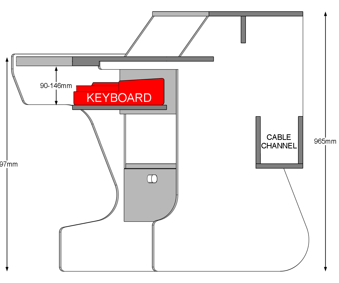 Telesto 2B gives you a height adjustable slide out keyboard tray suited to smaller, unweighted, MIDI keyboard instruments and synthesizers. The central computer display shelf is also height adjustable and may be set completely flush with the rest of the worktop if required.