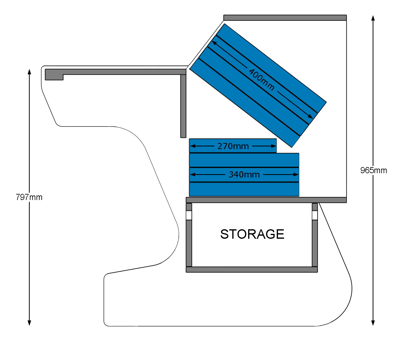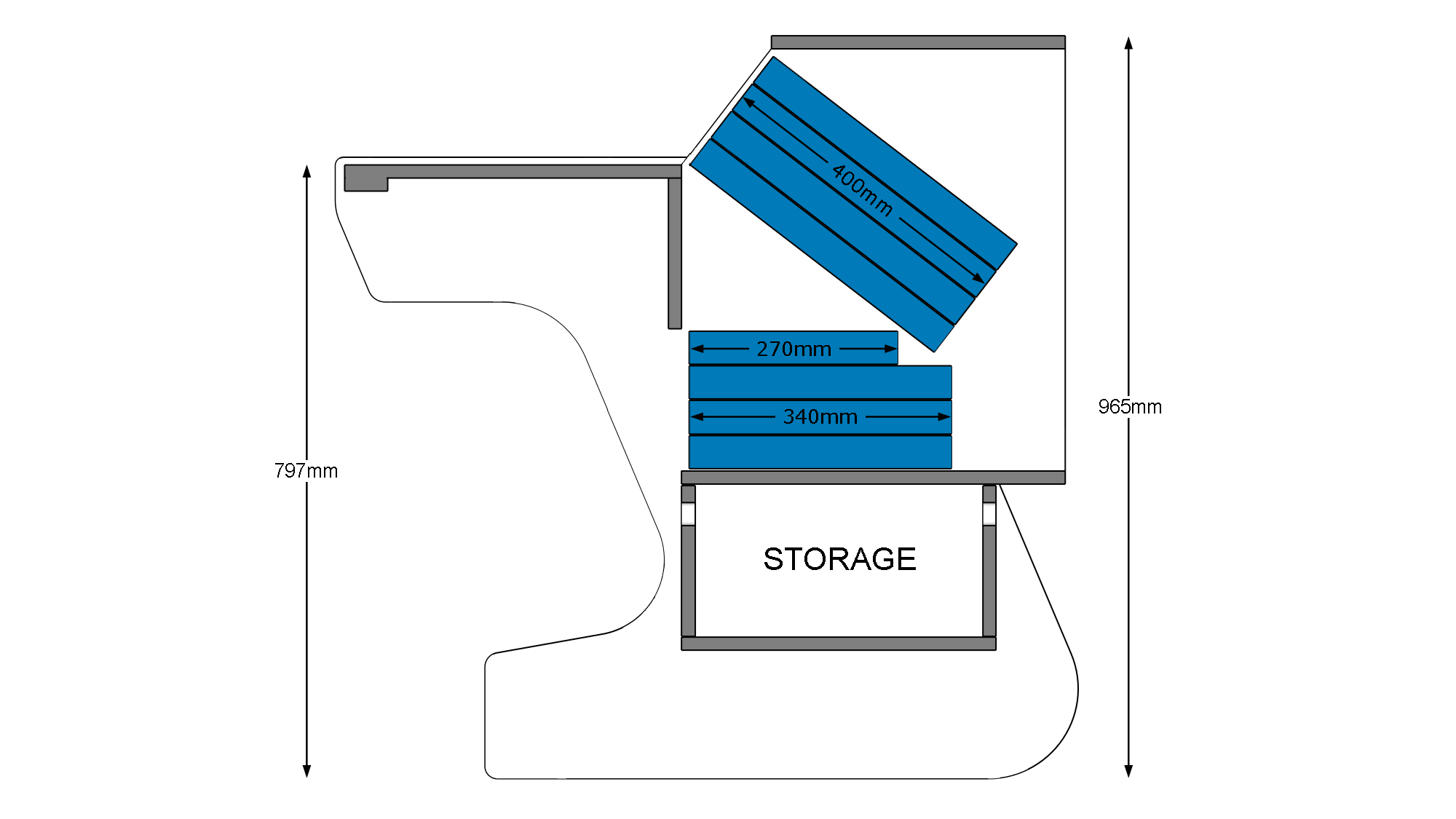 - Angled left and right rack bays (23.6 degrees from sitting position).